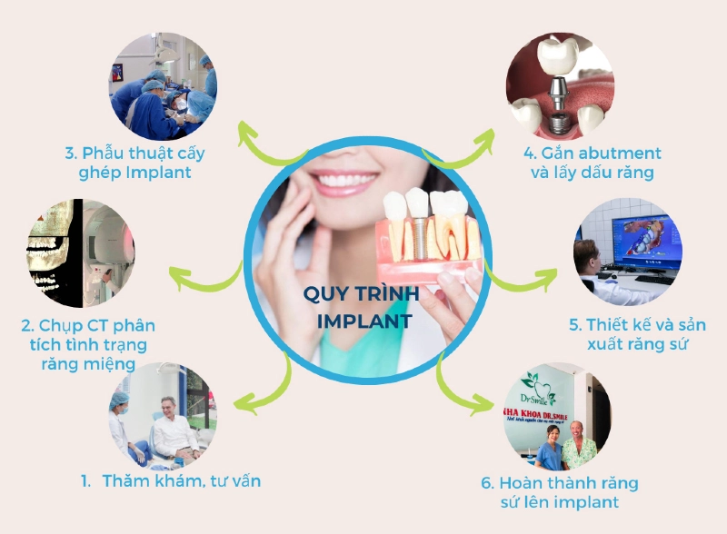 Hiện nay có nhiều quy trình cấy ghép implant được đề xuất và áp dụng. Phổ biến là quy trình cấy ghép implant được đề xuất bởi I.C.O.I dựa theo tiêu chí: Xâm lấn tối thiểu, tỉ lệ thành công cao, nhanh chóng, không đau, không chảy máu, không sưng nề. Cụ thể quy trình trải qua 2 giai đoạn như sau: