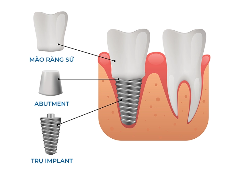 Răng implant được cấu tạo bởi 3 thành phần chính: Chân răng implant, trụ phục hình và răng sứ phía trên.